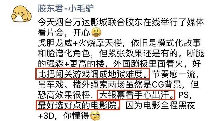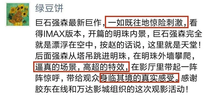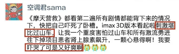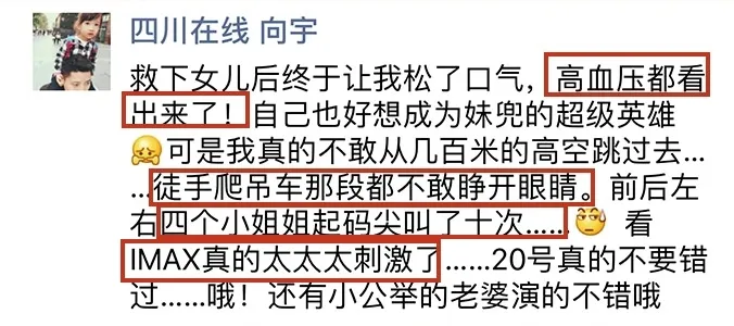 “高血压都看出来了,前后左右四个小姐姐起码尖叫了十次,看IMAX真的太太太刺激了!”、“全程肾上腺素飙升无尿点”、“好比把闯关游戏调成地狱难度,大银幕看手心出汗”。