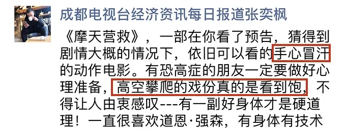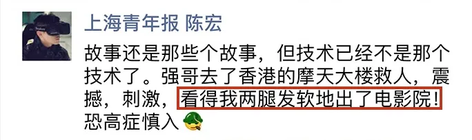 恐高症患者强烈表示了“抗议”却又忍不住安利:“刺激堪比过山车,吓哭了可是又好爽!”、“看的两腿发软地出了电影院,恐高症慎入”。