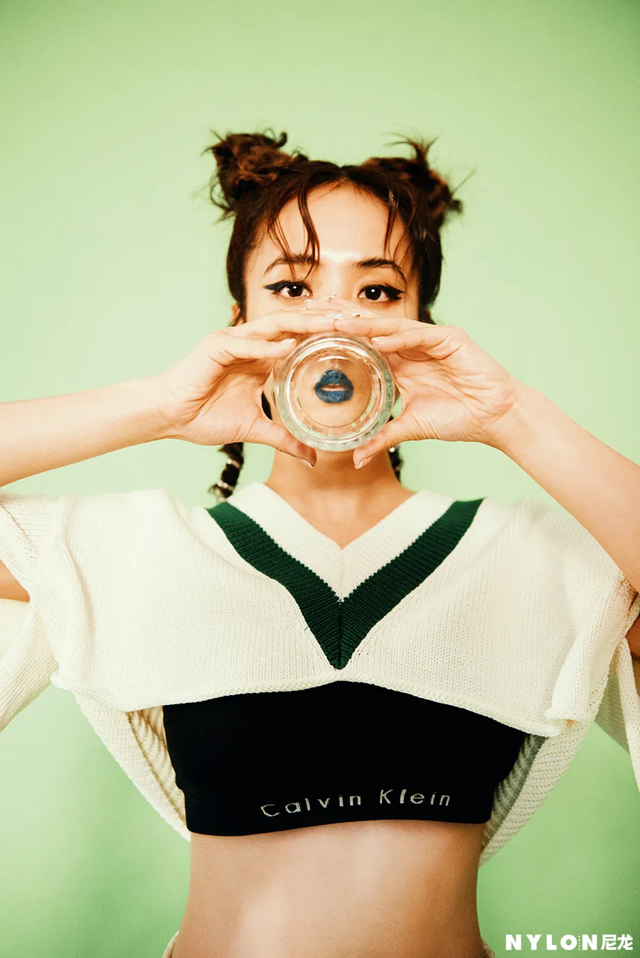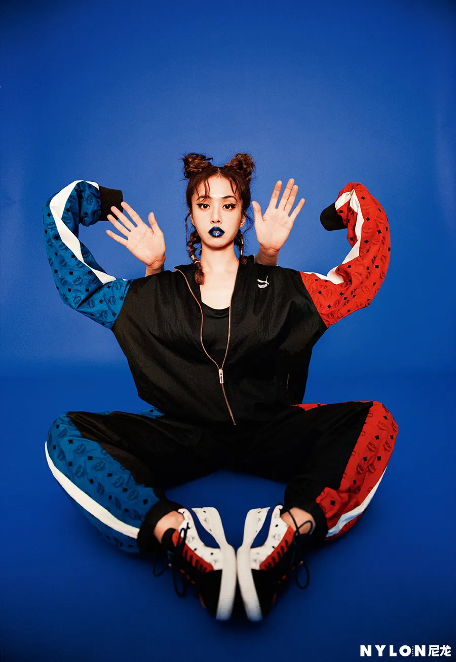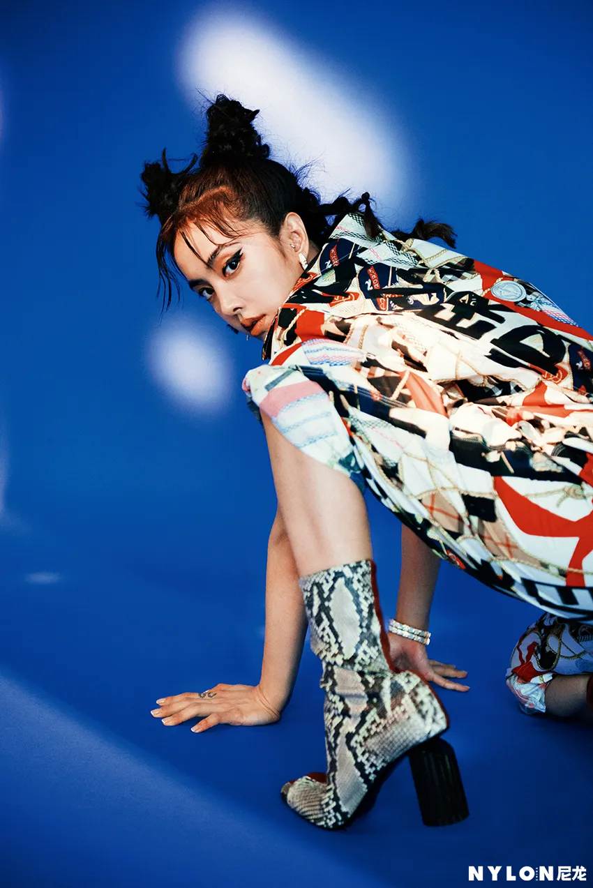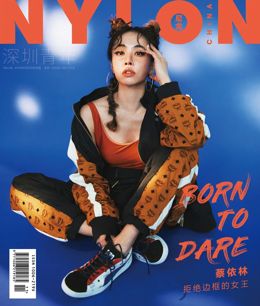 封面拍摄中,蔡依林以Bodysuit搭配运动套装造型亮相,橘色的Bodysuit展露出修长的脖颈与性感的锁骨,宽大的运动套装则让纤瘦的她散发出勃勃力量,在俏皮活泼 “哪吒头”的衬托下,自带率性青春感,宛若街头的叛逆少女,复古质感的色调让人想起卡带流行的时尚情怀。特殊剪裁的橘红色皮革洋装搭配靛蓝色的“中毒唇”,犀利的眼神直视镜头,色彩激撞的妆容与服饰让蔡依林看起来肤白如雪,性感魅惑。另一套造型中,蔡依林身穿运动Bra搭配针织衫与短裤,日常的玻璃杯被当作传声话筒,极富特色的彩色袜套高跟鞋完美勾勒出她修长的腿部线条,整体造型时髦清新,充满趣味。